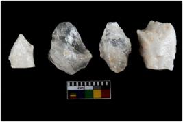 | Description / विवरण | Specimen of cores with weathered cortex and several broad fluted marks. Some of them are irregular in shape, whereas some are tapering at one end. |