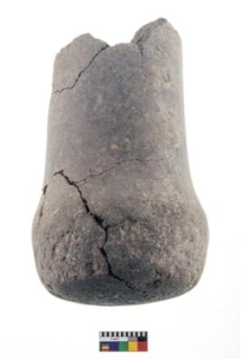 | Description / विवरण | A Partially broken specimen of a roughly rounded cylindrical shaped pounder stone with battered surfaced and truncated end to hold the object. |