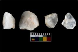 | Description / विवरण | Specimen of cores with weathered cortex and several broad fluted marks. Some of them are irregular in shape, whereas some are tapering at one end. |