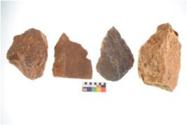 | Description / विवरण | Specimen of fluted cores having few broad fluted marks indicating the detached blades from it. All are uneven in shape and size. Three of them are tapering at one end. |