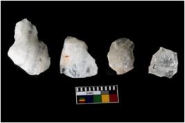 | Description / विवरण | Specimen of cores with weathered cortex and several broad fluted marks. Some of them are irregular in shape, whereas some are tapering at one end. |