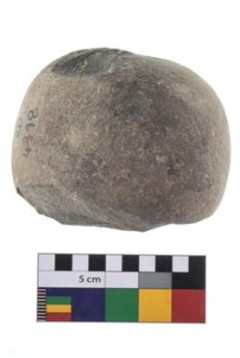 | Description / विवरण | A Hammer stone roughly rounded in shape with grounded edges. |
