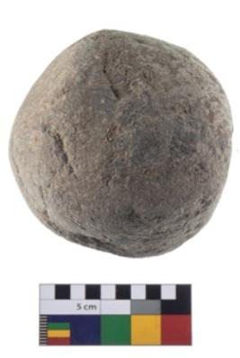 | Description / विवरण | A Hammer stone roughly rounded in shape with grounded edges. |