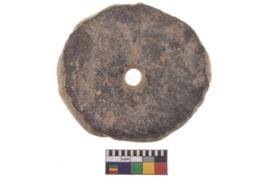 | Description / विवरण | A specimen of a spindle whorl eroded from the area around the perforation and diameter edge. The outer edge is uneven. It is well fired and reddish in colour. |