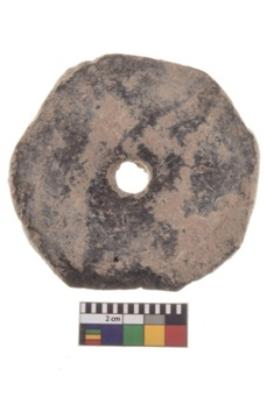 | Description / विवरण | A specimen of a spindle whorl eroded from the area around the perforation and diameter edge. The outer edge is uneven. It is well fired and reddish in colour. |