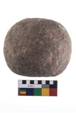 | Description / विवरण | A Hammer stone roughly rounded in shape with grounded edges. |