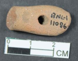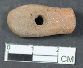 | Description / विवरण | A fragmentary plough having round flatened perforated top. Its colour is dull red and surface is rough. |