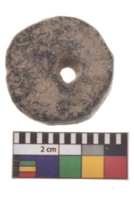 | Description / विवरण | A specimen of a spindle whorl eroded from the area around the perforation and diameter edge. The outer edge is uneven. It is well fired and reddish in colour. |