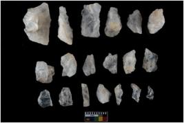 | Description / विवरण | There are 20 flake objects; some of the flake has a sharp pen point. The ridges on the sides of the flakes are visible. Traces of retouching can be noticed. |