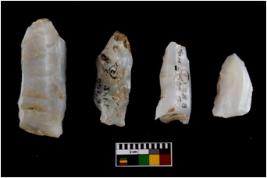 | Description / विवरण | Specimen of a fluted cores with several broad fluted marks indicating the detached blades from it. Some of them are tapering at one end. |