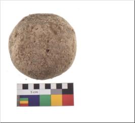 | Description / विवरण | Specimen of a sling ball with rough surface. |