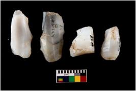 | Description / विवरण | Specimen of a fluted cores with several broad fluted marks indicating the detached blades from it. Some of them are tapering at one end. |