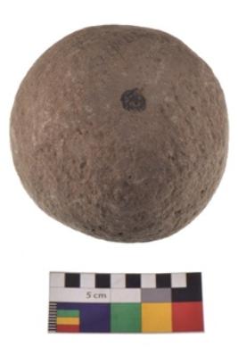 | Description / विवरण | Specimen of a round grinding stone. It has battered surface along with curved ridges. |