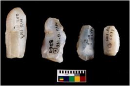 | Description / विवरण | Specimen of a fluted cores with several broad fluted marks indicating the detached blades from it. Some of them are tapering at one end. |