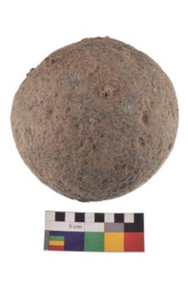 | Description / विवरण | Specimen of a round grinding stone. It has battered surface along with curved ridges. |