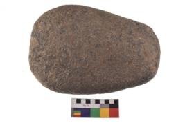 | Description / विवरण | Specimen of an oval shaped grinding stone. It has battered surface along with curved ridges. |