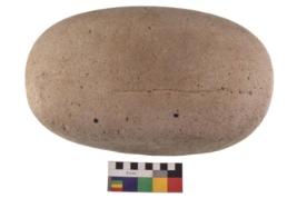 | Description / विवरण | Specimen of a smooth oval shaped grinding stone. It has battered surface along with curved ridges. |