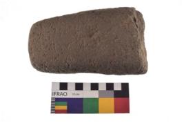 | Description / विवरण | Specimen of an oval shaped saddle quern. It has battered surface along with curved ridges. |