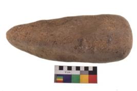| Description / विवरण | Specimen of a grinding stone. It has battered surface along with curved ridges. |