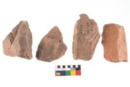 | Description / विवरण | Specimen of flake tool with prominent flaking marks. They are made up of a short flakes with sides trimmed and some are rectangular in shape. |