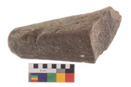 | Description / विवरण | Specimen of an oval shaped saddle quern. It has battered surface along with curved ridges. |