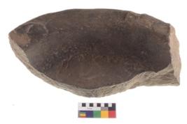 | Description / विवरण | Specimen of a round shaped grinding stone. It has battered surface along with curved ridges. |