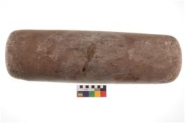 | Description / विवरण | Specimen of an oval shaped saddle quern. It has battered surface along with curved ridges. |