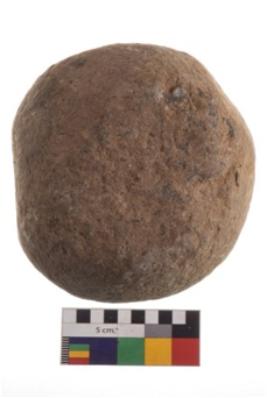 | Description / विवरण | Specimen of an round shaped saddle quern. It has battered surface along with curved ridges. |