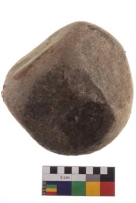 | Description / विवरण | Specimen of an round shaped saddle quern. It has battered surface along with curved ridges. |