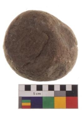 | Description / विवरण | Specimen of an round shaped saddle quern. It has battered surface along with curved ridges. |