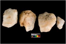 | Description / विवरण | Specimen of cores with weathered cortex and very few fluted marks. Most of them are uneven whereas some are tapering at one end. |