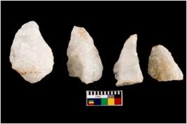 | Description / विवरण | Specimen of cores with weathered cortex and very few fluted marks. Most of them are uneven whereas some are tapering at one end. |