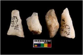 | Description / विवरण | Specimen of cores with weathered cortex and very few fluted marks. Most of them are uneven whereas some are tapering at one end. |