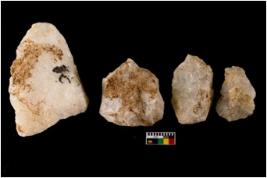 | Description / विवरण | Specimen of cores with weathered cortex and very few fluted marks. Most of them are uneven whereas some are tapering at one end. |