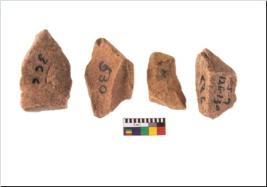 | Description / विवरण | Specimen of flake tool with prominent flaking marks. They are made up of a short flakes with sides trimmed and most of them are rectangular in shape. |