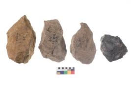 | Description / विवरण | These are n 4 of worked tools. They are tapering at one end and have sharp edges. They have round base and show dominant irregular scar pattern. |