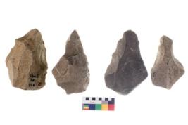 | Description / विवरण | These are n 4 of worked tools. They are tapering at one end and have sharp edges. They have round base and show dominant irregular scar pattern. |