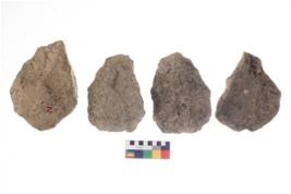 | Description / विवरण | These are n 4 of worked tools. They are tapering at one end and have sharp edges. They have round base and show dominant irregular scar pattern. |