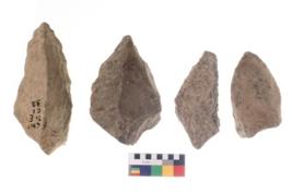 | Description / विवरण | These are n 4 of worked tools. They are tapering at one end and have sharp edges. They have round base and show dominant irregular scar pattern. |