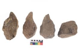 | Description / विवरण | These are n 4 of worked tools. They are tapering at one end and have sharp edges. They have round base and show dominant irregular scar pattern. |