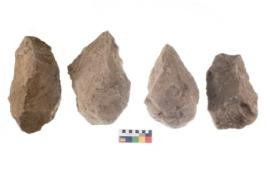 | Description / विवरण | These are n 4 of worked tools. They are tapering at one end and have sharp edges. They have round base and show dominant irregular scar pattern. |