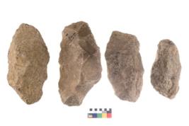 | Description / विवरण | These are n 4 of worked tools. They are tapering at one end and have sharp edges. They have round base and show dominant irregular scar pattern. |