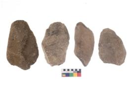 | Description / विवरण | These are n 4 of worked tools. They are tapering at one end and have sharp edges. They have round base and show dominant irregular scar pattern. |
