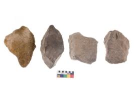 | Description / विवरण | These are n 4 of worked tools. They are tapering at one end and have sharp edges. They have round base and show dominant irregular scar pattern. |