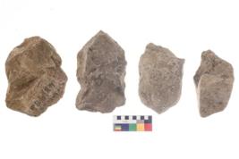 | Description / विवरण | These are n 4 of worked tools. They are tapering at one end and have sharp edges. They have round base and show dominant irregular scar pattern. |