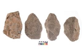 | Description / विवरण | These are n 4 of worked tools. They are tapering at one end and have sharp edges. They have round base and show dominant irregular scar pattern. |