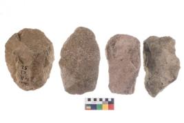 | Description / विवरण | These are n 4 of worked tools. They are tapering at one end and have sharp edges. They have round base and show dominant irregular scar pattern. |