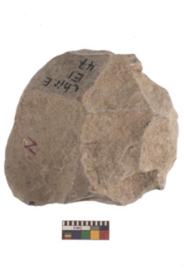 | Description / विवरण | The specimen is utilized worked. It shows irregular dominant scar pattern on the dorsal and ventral side and has uneven surface. |
