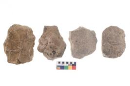 | Description / विवरण | These are n 4 of worked tools. They are tapering at one end and have sharp edges. They have round base and show dominant irregular scar pattern. |