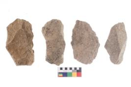 | Description / विवरण | These are n 4 of worked tools. They are tapering at one end and have sharp edges. They have round base and show dominant irregular scar pattern. |